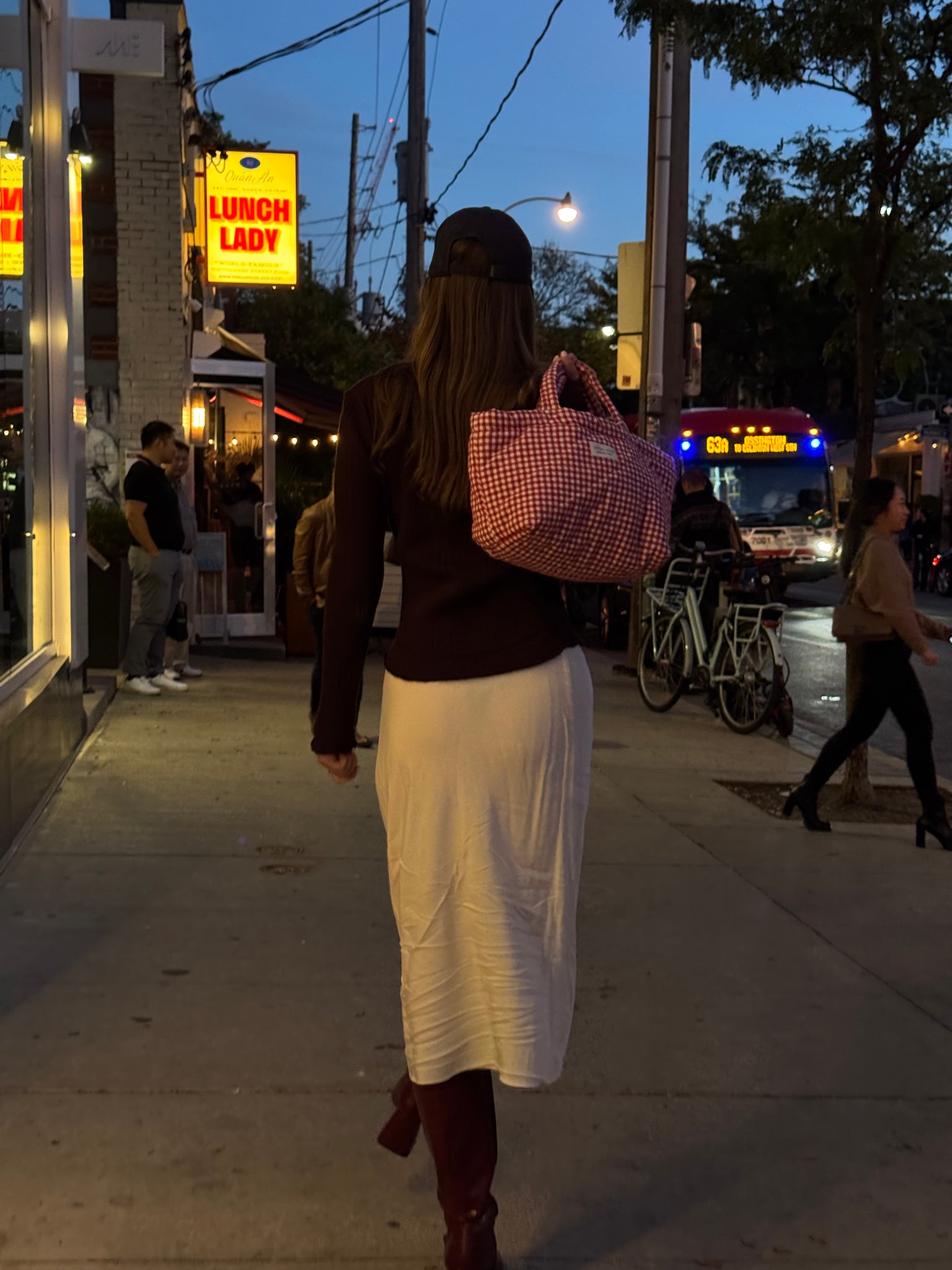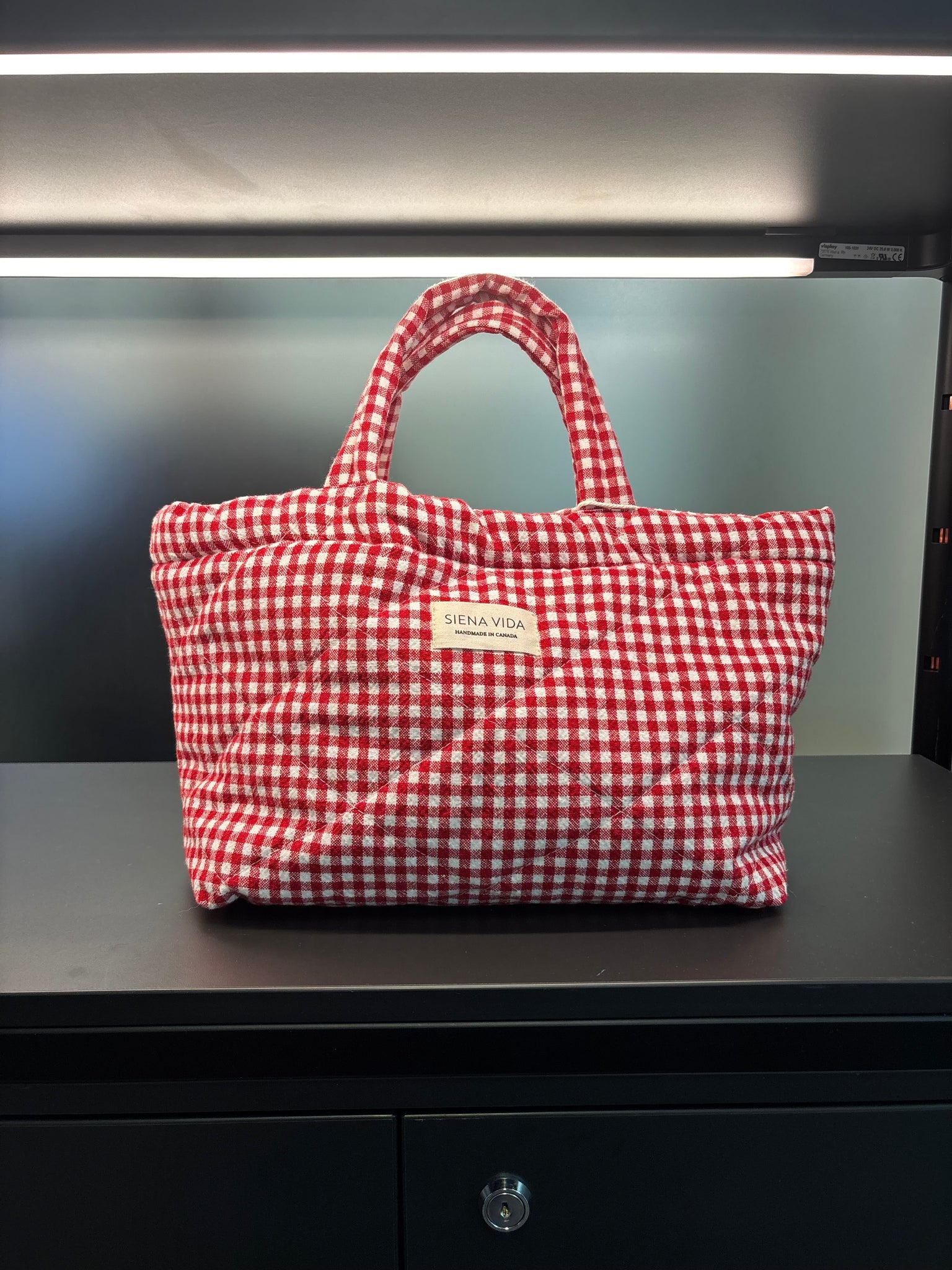 A compact take on our classic quilted tote. Handmade in Toronto from sustainably sourced Organic Cotton, this smaller size is perfect for everyday errands, light essentials, or carrying just the right amount on the go. Finished in timeless gingham, it features a roomy interior with an internal pocket to keep your must-haves organized. A tree is planted with every order.