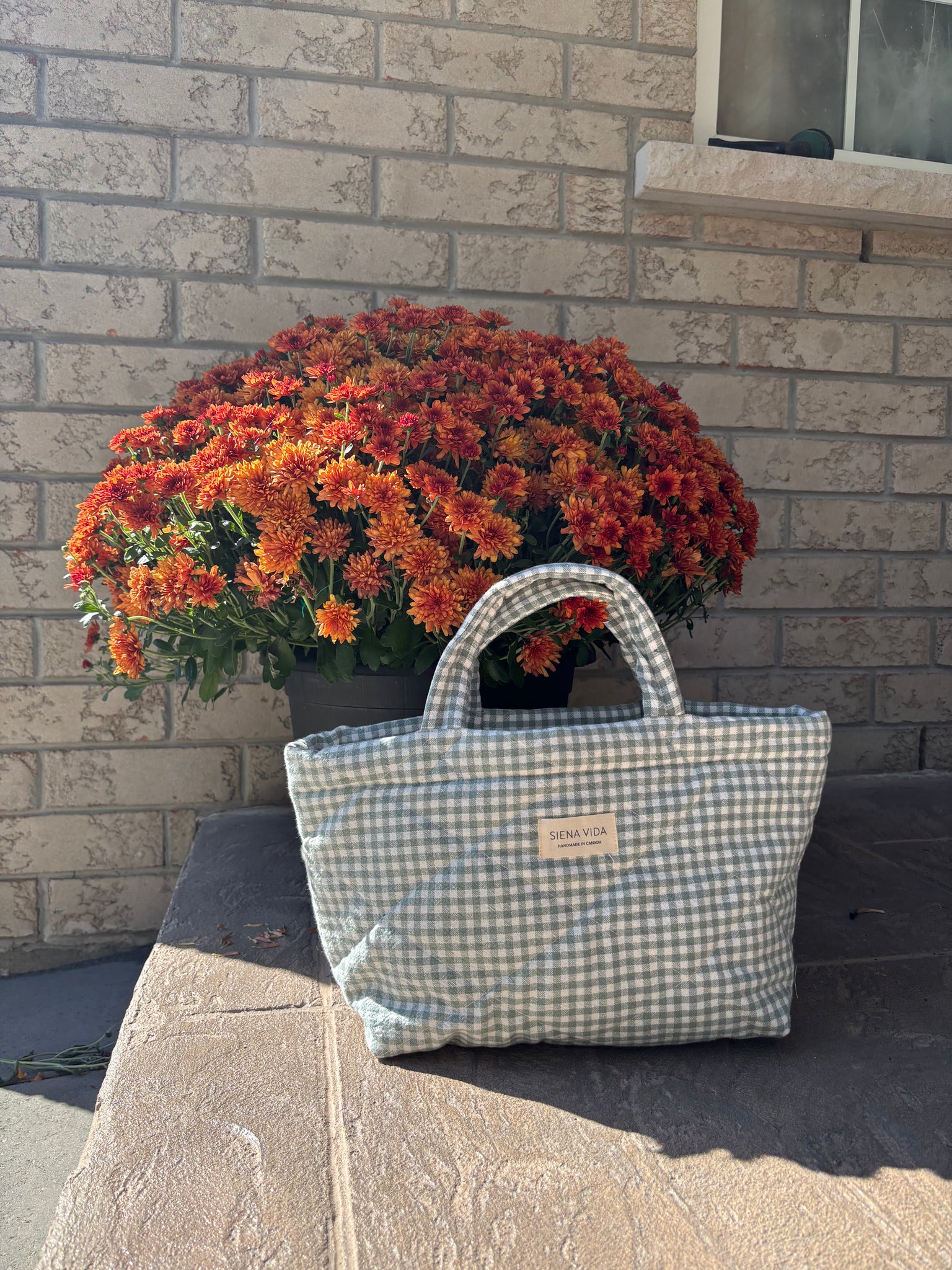 A compact take on our classic quilted tote. Handmade in Toronto from sustainably sourced Organic Cotton, this smaller size is perfect for everyday errands, light essentials, or carrying just the right amount on the go. Finished in timeless gingham, it features a roomy interior with an internal pocket to keep your must-haves organized. A tree is planted with every order.