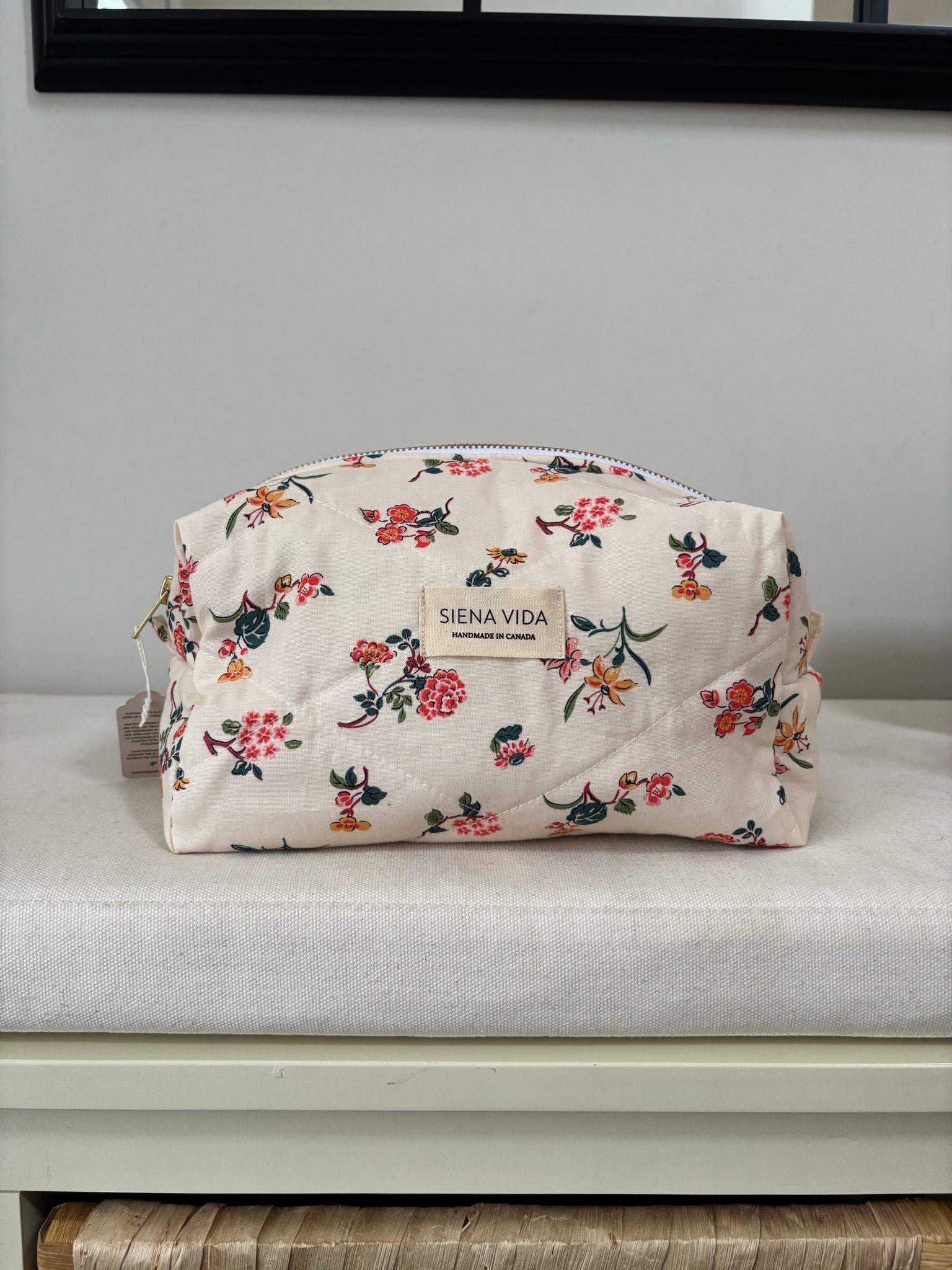 Featuring a soft cream base with a romantic floral print, this pouch brings a timeless, vintage-inspired feel to your daily routine.